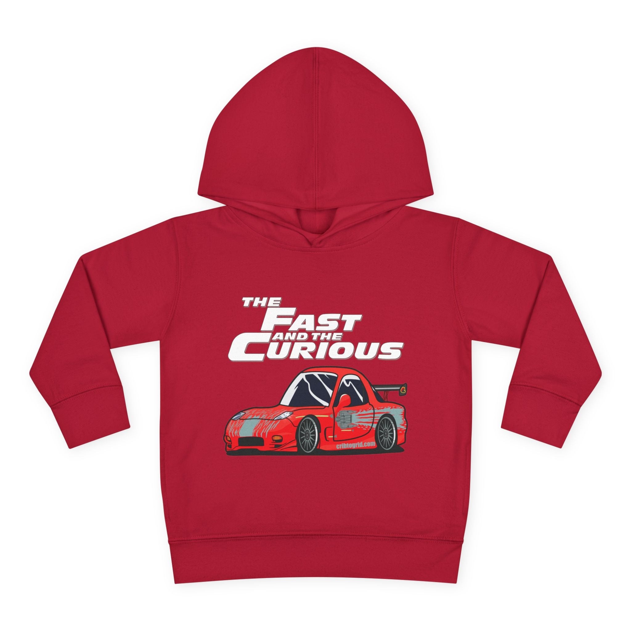 Keep your little car fan warm and race-ready with our "The Fast and the Curious" toddler hoodie! Featuring a playful cartoon of Dom’s iconic red RX-7 and a fun spin on the classic movie title, this hoodie is perfect for tiny gearheads with big dreams and even bigger curiosity.